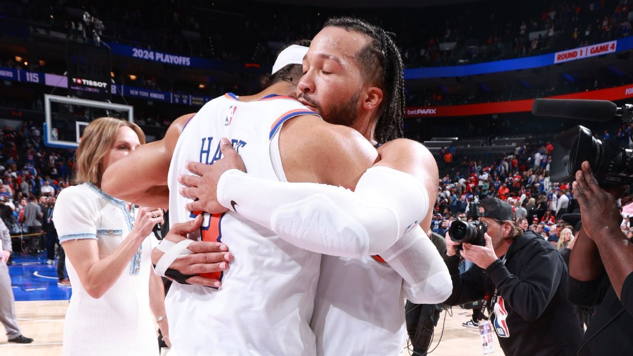 Tim Bontemps, ESPNMay 2, 2024, 11:52 PM ET Open Extended Reactions PHILADELPHIA — The Villanova boys did it again. Jalen Brunson had 14 of his 41 points in the fourth quarter and hit Josh Hart for his 12th assist, and what became the winning 3-pointer with 24 seconds remaining, as the New York Knicks escaped